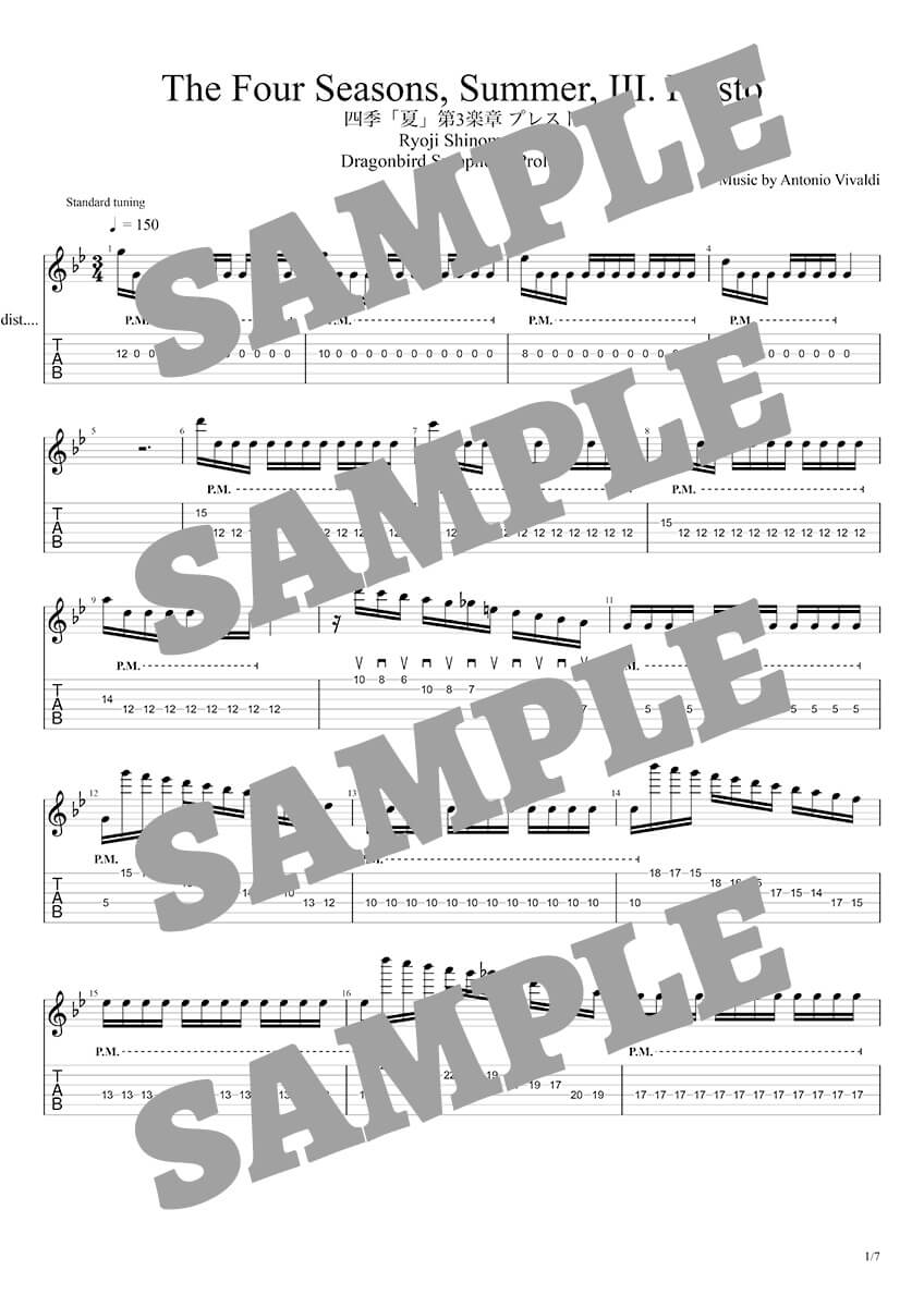 Ryoji:冒頭の有名なセクションは、ピックでしっかりと歯切れよく弾くことを意識しています。中盤の16分のリズムで弾き切るところは、オルタネイトのフル・ピッキングの練習にはもってこいですね。ハイ・ポジションで弾くのがきつい場合は、1オクターヴ下げたポジションで弾いてもいいと思います。実はアルバムの音源でも、1オクターヴ下げた音を重ねているんです。
