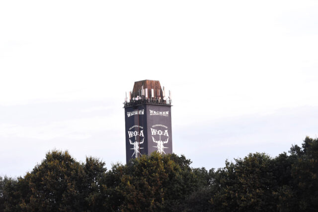 それでも、ヴァッケナー達は全く動じない。無論、慌ててその場を離れる観客もいるにはいたが、WOAに通い詰めている猛者達にとっては、こんなのシャワー代わりと言わんばかり。みんな普通に(?)盛り上がっている。そもそも、メイン・ステージ前はだだっ広い野っ原でしかなく、雨宿り出来るところなどほぼ皆無。かろうじて、ビール・スタンドの狭い軒先に逃げ込むか、あとはトイレに駆け込むか…ぐらいしかない。ステージ前に居並ぶメタル・ガード(セキュリティ)達は「よっしゃ、やっぱり降ったか!」とばかりに、何故かみんな笑顔。まぁ、降らないことの方が珍しいワケで、「やっぱこれでこそWOAだよな〜」とはしゃぐその中のひとりに、「ようこそ北ドイツへ!」と言われたりも。