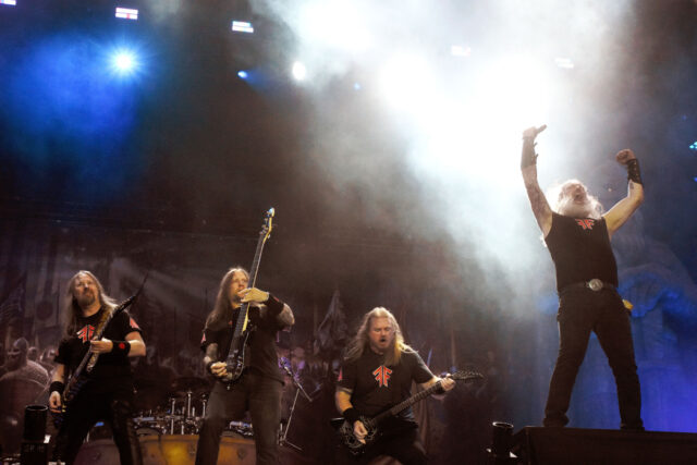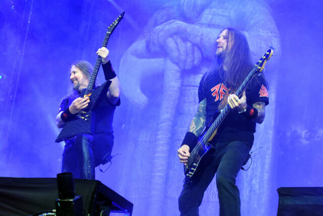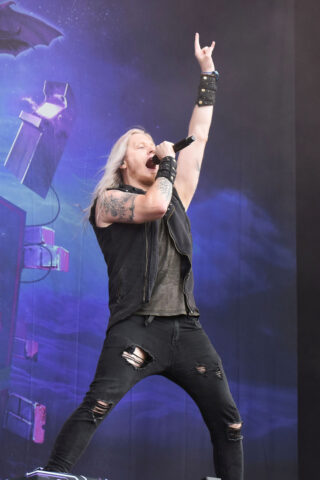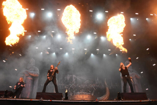 彼等もまた、WOA常連中の常連で、何とこれが出演10回目! ステージ上には、古えのヴァイキング戦士の巨大石像が二体そびえ立ち、ドラム・セットも巨大なヴァイキングの兜の上に設置されている。ショウ開始と同時に、大きな火柱がドバドバ上がりまくるのも、アモンのライヴではいつもの光景だ。